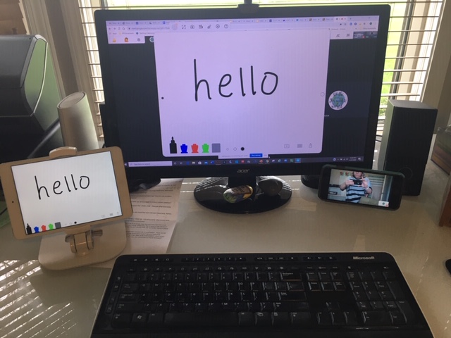 I also needed a white board. I tried using an actual white board with real markers and holding it up to the camera, but the glare was so bad that students had a difficult time seeing what I was showing them. So I set up a virtual white board via my Ipad mini tablet. I mirror my table to my PC monitor using the free version of an app called ApowerMirror. I had to load that onto my tablet and my PC. It was easy and worked flawlessly. I then loaded another free app on my tablet called "Whiteboard". Voila! Now when I am in present mode, my students can see what I write on the whiteboard app of my tablet. I can toggle between this whiteboard and other visuals that I am using, such as digital texts, and Google Slides.