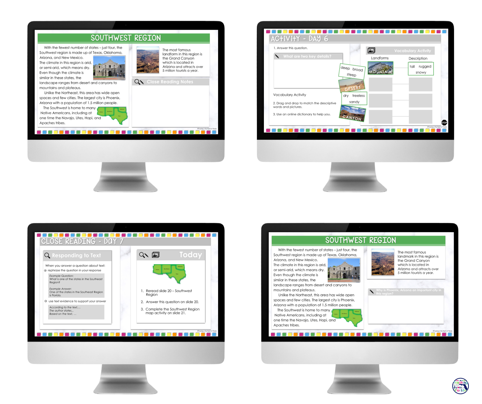 This resource has a 14-day lesson sequence that includes close reading, text-dependent questions, writing, graphic organizers, interactive vocabulary, and map skills for each region. It gives your students the opportunity to use all those amazing reading skills with Social Studies content in an engaging lesson sequence.