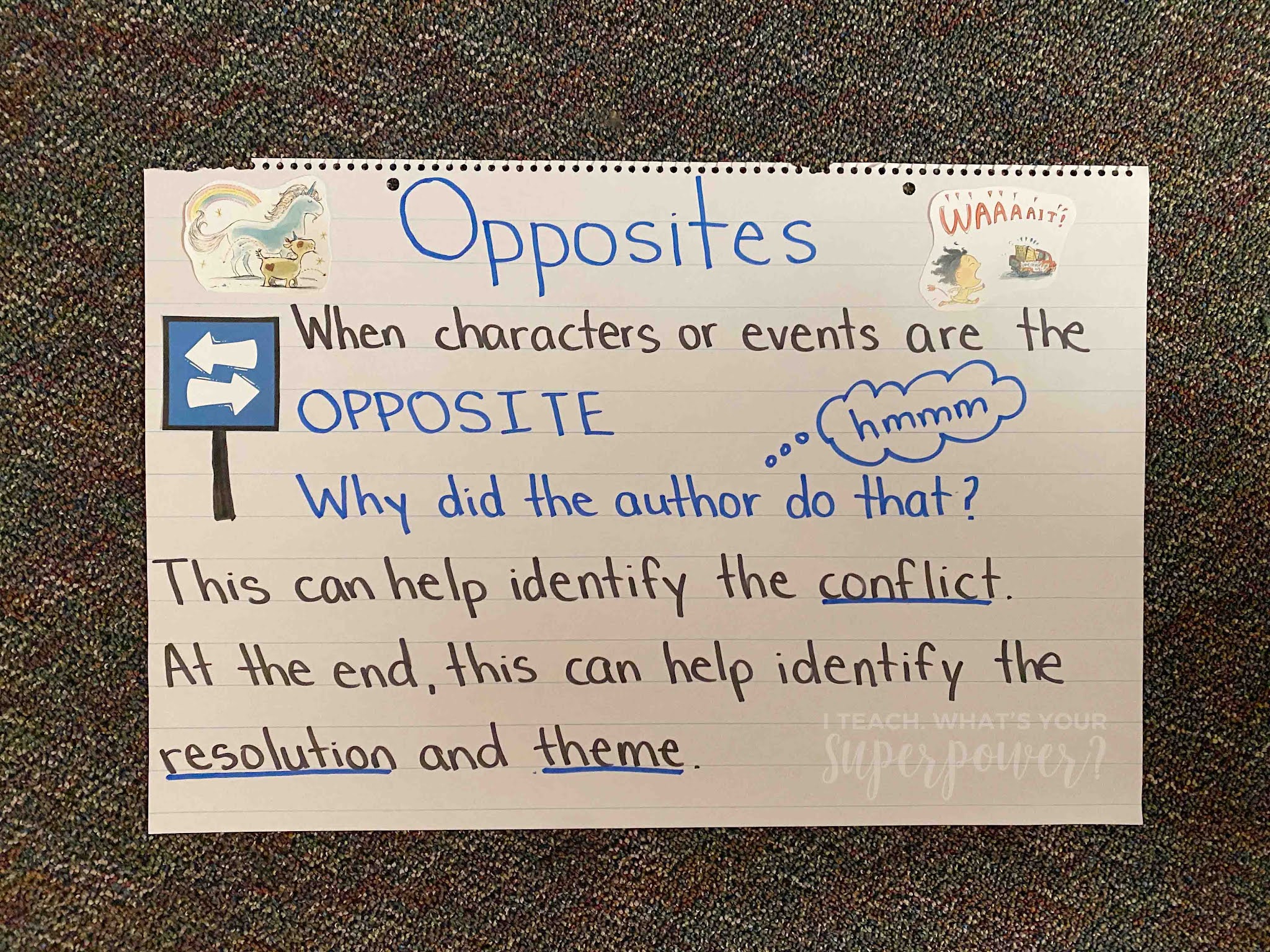 It includes a strong opposite at both the beginning that sets the problem and one at the end that leads kids to theme. (That's right-the T word.)