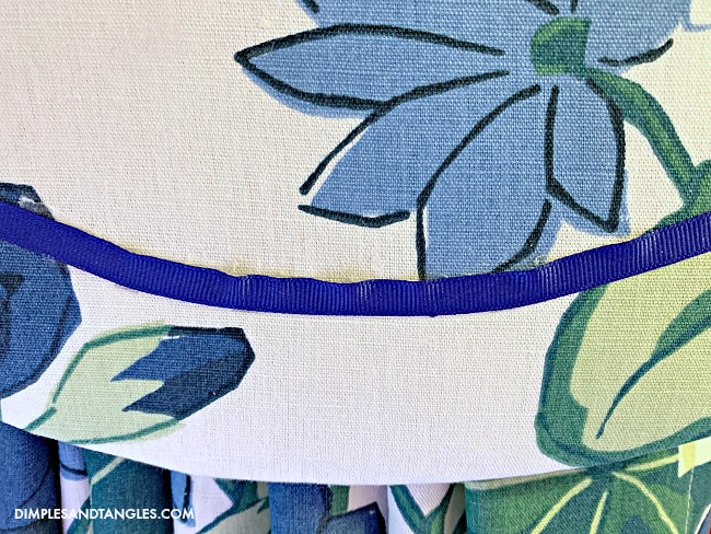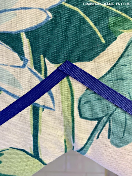 If you made a design with a curve, you're kind of limited on the trim you can use because it needs to be flexible to lay flat along the curve.  Something like a gimp trim would work, but I couldn't find the color I wanted so I just stuck with grosgrain ribbon.  Another tip, you can't use ribbon that's too wide or it won't lay flat along the curve.  I tried 5/8" ribbon first and it didn't work, so I switched to 3/8" and it was ok.