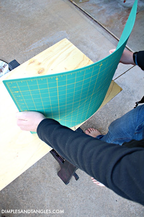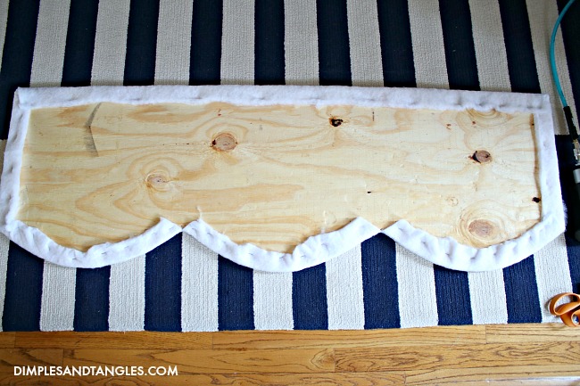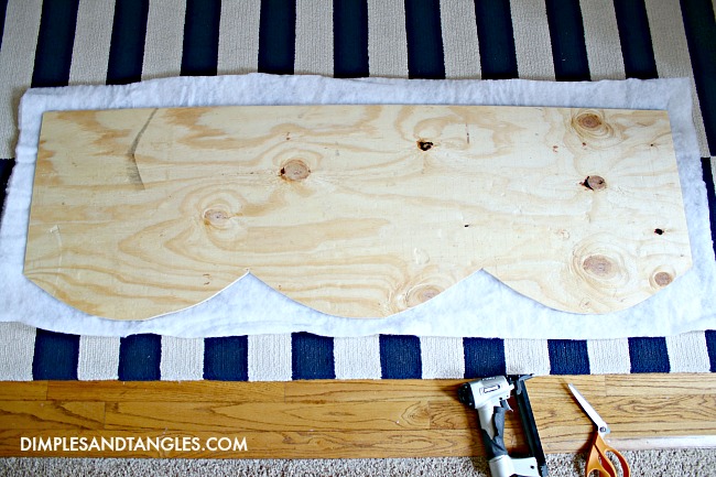 Next, you'll need to wrap the board with batting to give it some softness and padding.  Lay the board on top of a piece you've cut, leaving a few extra inches of batting all the way around.