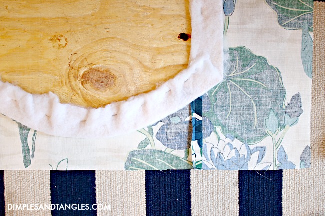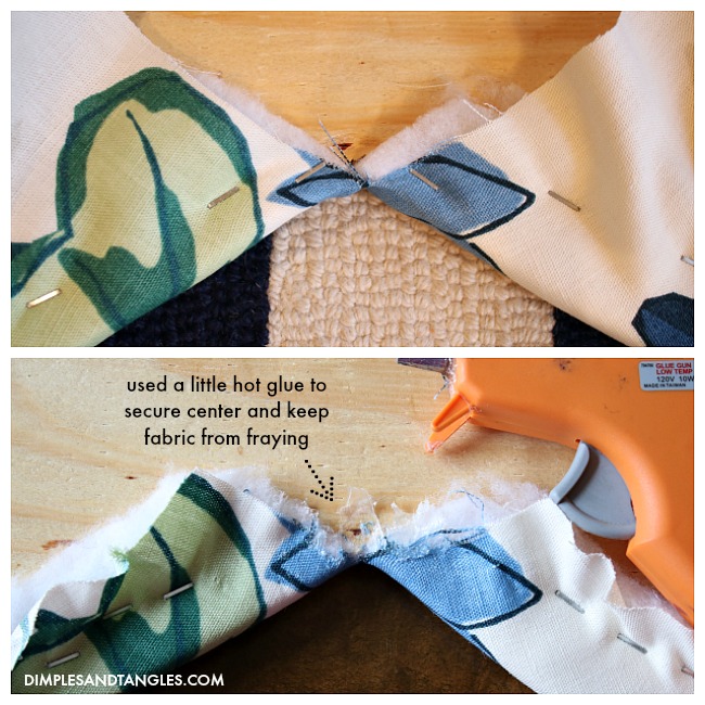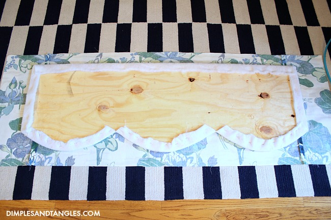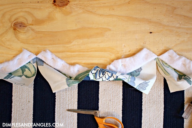Then, start pulling and stapling all the way around.  The scallop dips were the trickiest parts, I found it easiest to pull and staple as close as I could to the V, but then I hot glued the very center just a bit where I couldn't pull and staple as tightly.  The glue will also keep the fabric from ripping and fraying any more at the end of the cut.