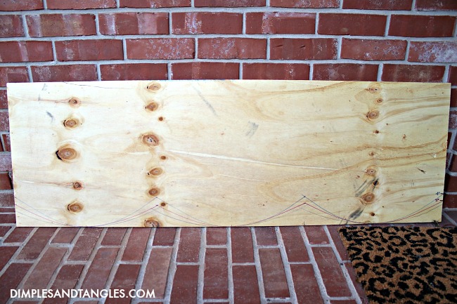 I couldn't find anything round that would fit exactly where I wanted the curve to go, so we used my sturdy but flexible cutting mat and lined it up at the deepest scallop points, aligning it with the bottom edge of the board to create the curve.  You'll need an assistant to help you so you can trace the line while they hold the curve in place.