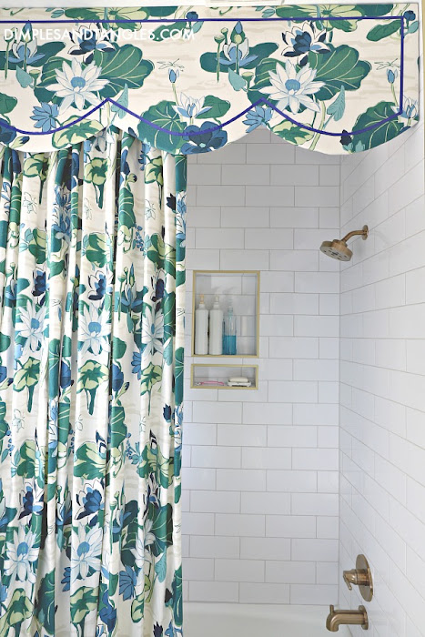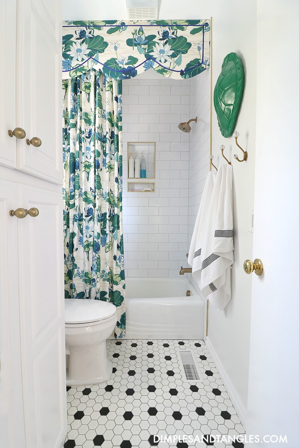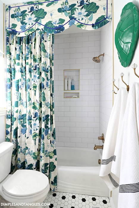 Tub/Shower Faucet  ||  Subway Tile- Floor & Decor  ||  Brass Schluter Metal Edge Trim- Floor & Decor  ||  Subway Tile Grout-  ||  Shower Curtain Fabric-  (similar color here)  ||  Extra Long Shower Curtain Liner  ||  Shower Cornice Ribbon Trim- Joann  ||  Soap Dish  ||  Turtle Shell- past season Nate Berkus for Target  ||  Towel Hooks  ||  Toilet  ||  Toilet Paper Holder