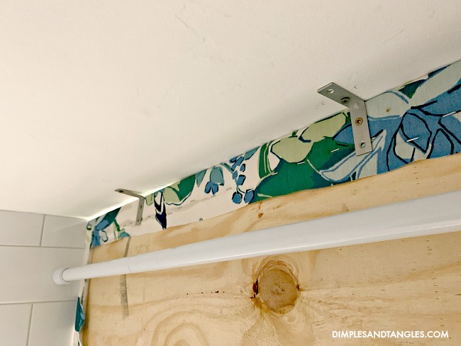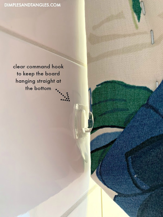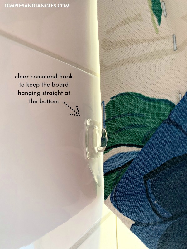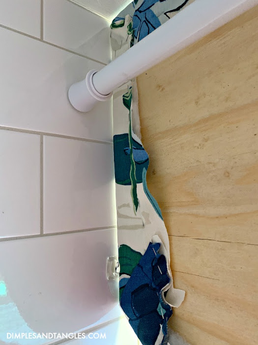 One last little issue- since we suspended from the ceiling the bottom of the cornice hung a little crooked against the tile,  the bottom tending to swing inward toward the shower.  I needed to push the bottom out a bit, so I used some small clear command hooks to push the bottom toward the outside of the shower a bit and align it correctly.  I just chose a hook because it had some bulk I needed to hold the board forward.  Worked great!  I considered just pushing the curtain rod tighter against the cornice to bump the bottom out, but that hindered the rings from sliding easily.