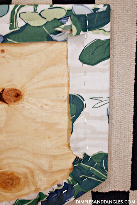 One note, the fabric was not quite wide enough for the length of my board.  I decided that I wanted to add on some right along the edge, knowing that I planned to add some trim and hoping that it would cover them up.  Be sure to match your pattern and piece together appropriately if you're working with a patterned fabric.  That was probably the trickiest part of this whole project!