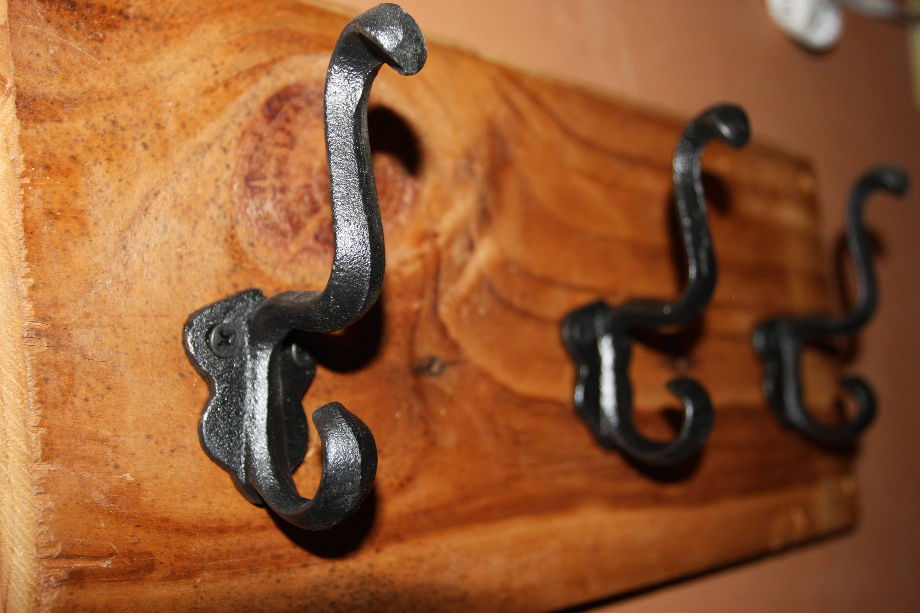 The wall hooks are solid cast iron and they are hand-cast. They are finished in a nice rustic flat black powder coat finish which inhibits rust.
