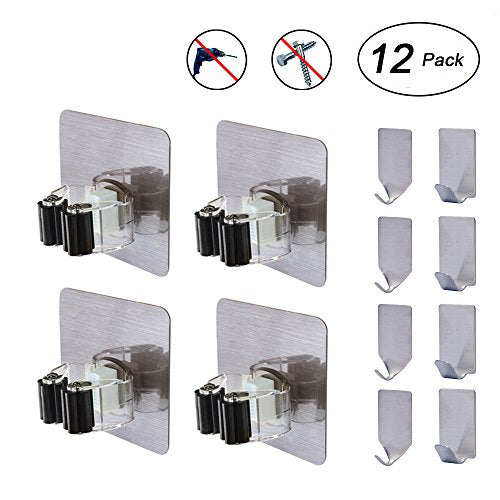 Mop Holder, Flecom Broom Holder Wall Mount with Adhesive Hooks Heavy Duty Wall Hooks Waterproof Wall Hangers