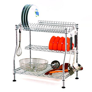 You can directly contact us by e-mail if any questions or problems regarding our products, including any aspect of dissatisfaction review after you have purchased our products. We are committed to answering you in 24 hours and responsible for the matter until you are satisfied. Why to choose us Sturdy Construction Heavy duty and rust-resistant chrome plated carbon steel keep the rack durable Space-Saving 3 Tier design offer more space to storage dishes, bowls and cups; Removable Hooks Good for hanging scrub brush, dish-clouts, peelers, spoons, spatulas Catch Each Excess Water The bottom draining tray is easily removed when collecting lots of water 4 Rubber Foots It increases the stability to keep dish drying rack more stable Modern Design It's fashion & elegant, and is a very useful accessory to tidy your Kitchen. Specification Material: Chrome Plated Carbon Steel Color: Silver Style: 3 Tier Rack Holder Size: 17.7”(L) x 11.8”(W) x 17.3”(H) Note Please refer to the user manual to install the dish rack before using. To prolong it lifespan, it's suggested to dry dishes before putting in the dish drainer. Package Included 1 x Dish Rack 1 x Plastic Draining Tray 1 x Manual User Quality Guarantee FDA, CE, ROHS, FCC approved We offer 1 year warranty.For whatever reason you don’t love SUNCOM's Dish Drying Rack, let us know so we can give you a full refund or send you a replacement. NO questions asked.